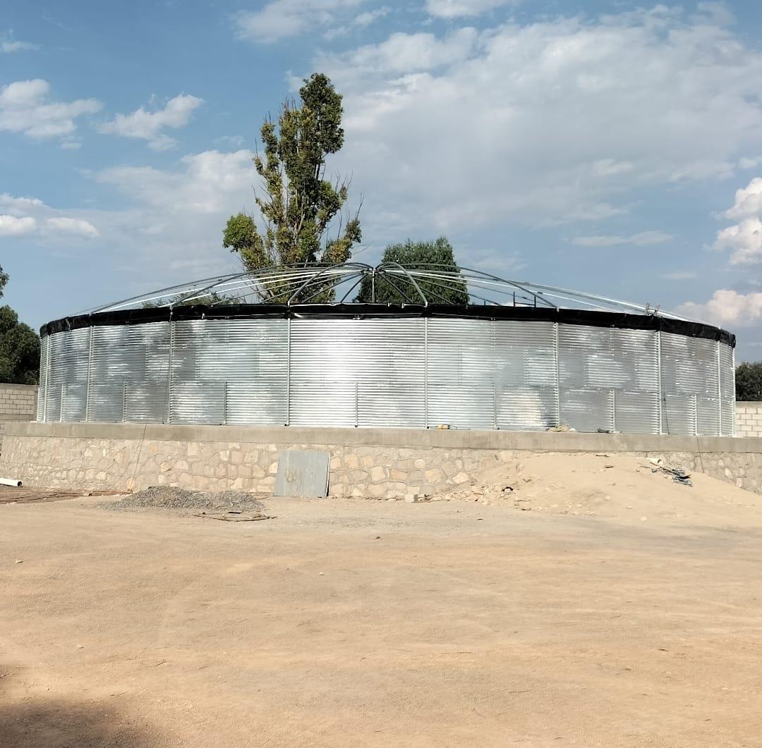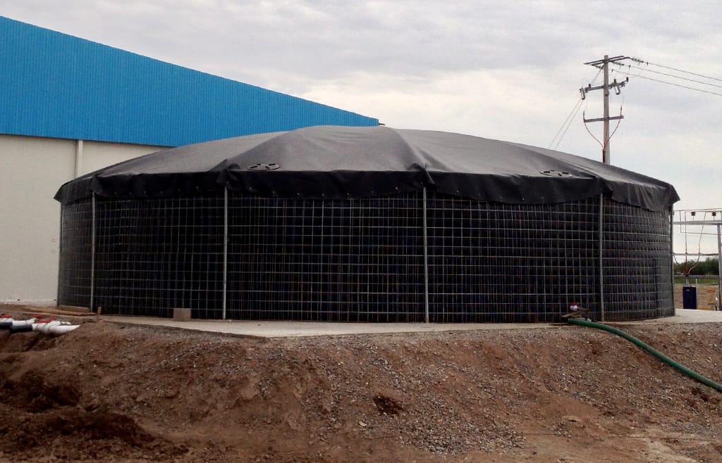 Estanque de geomembrana con estructura de lamina galvanizada con cubierta, especial para el almacenamiento de liquidos pesados como melaza, con capacidad de hasta 1,000,000 de litros.